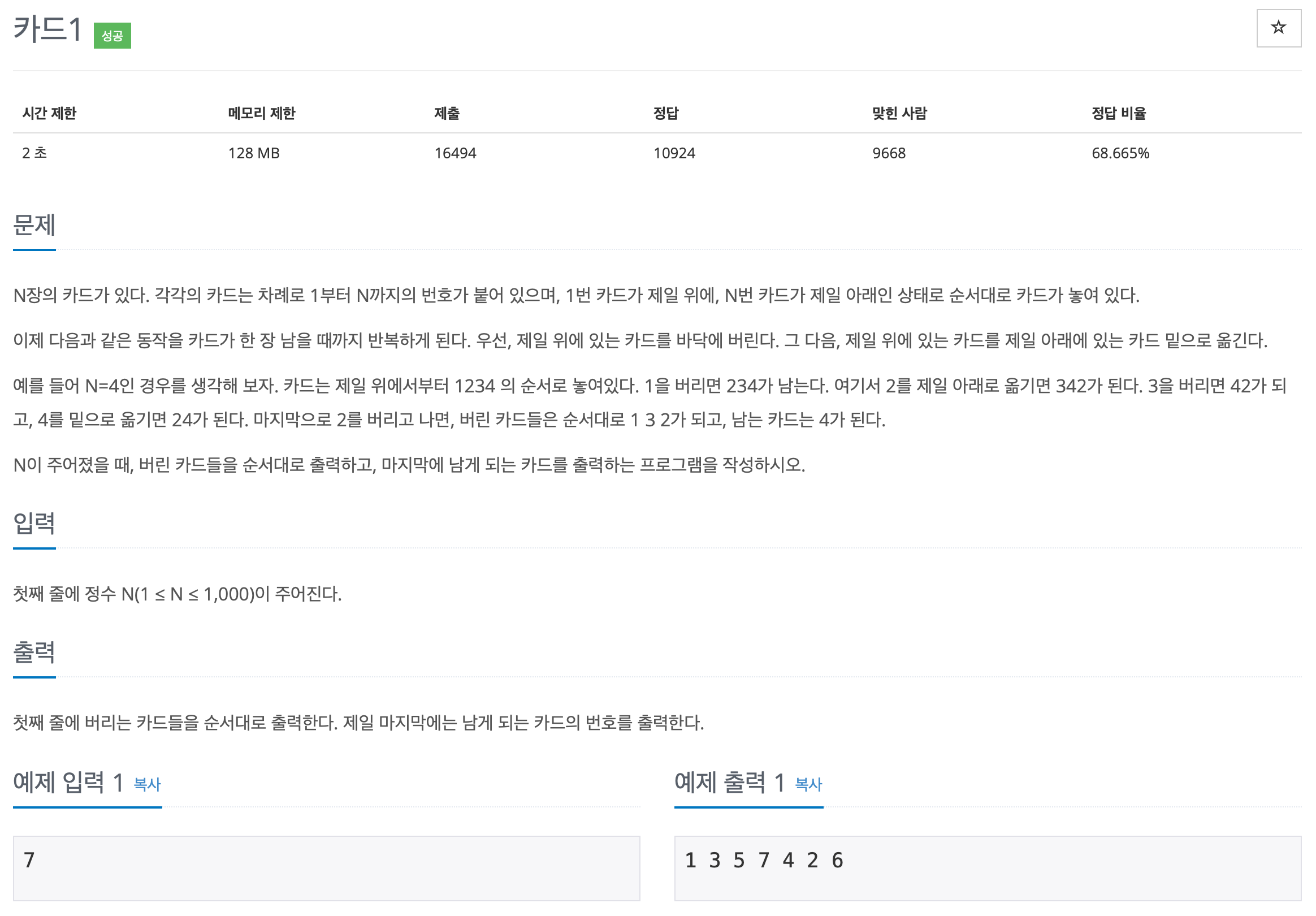 N장의 카드가 있다. 각각의 카드는 차례로 1부터 N까지의 번호가 붙어 있으며, 1번 카드가 제일 위에, N번 카드가 제일 아래인 상태로 순서대로 카드가 놓여 있다. 이제 다음과 같은 동작을 카드가