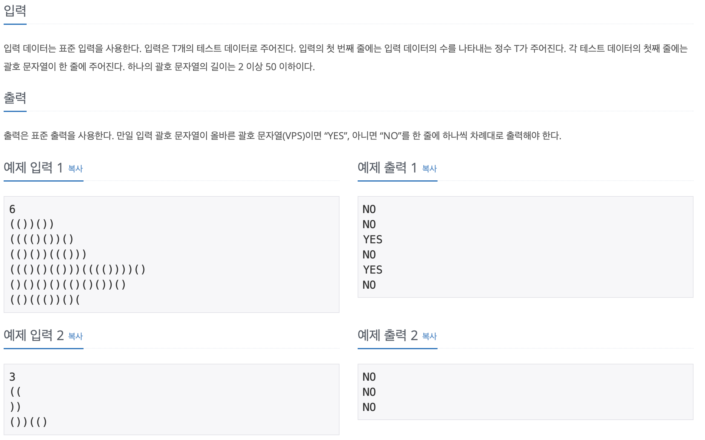 간단하게 설명하면 말 그대로 괄호를 열고 닫는 문제입니다. 이것을 VPS(Valid PS)라고 부릅니다. 올바르게 괄호가 열리고 닫힌다면 Yes를 괄호가 닫히지 않는다면 NO를 출력하는 문제입니다.