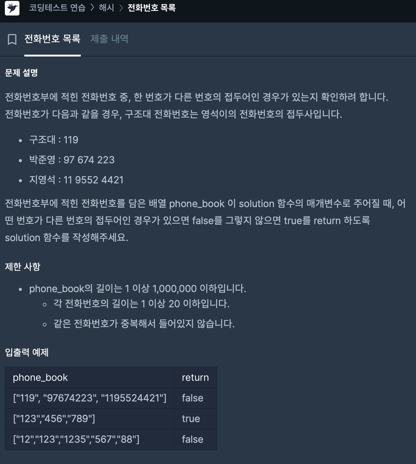 오늘 풀어본 문제는 프로그래머스에 전화번호 목록입니다.
