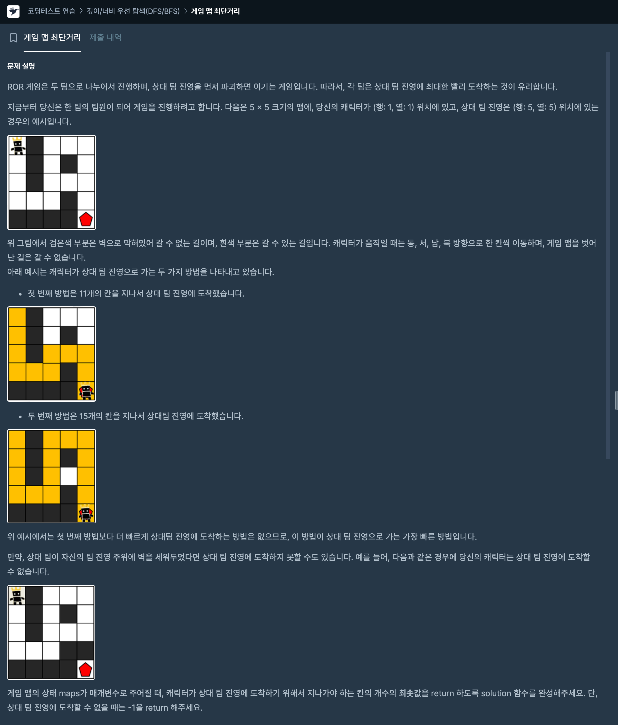 프로그래머스에서 DFS/BFS 문제 중 하나인 게임 맵 최단거리 문제를 풀어보았습니다.
