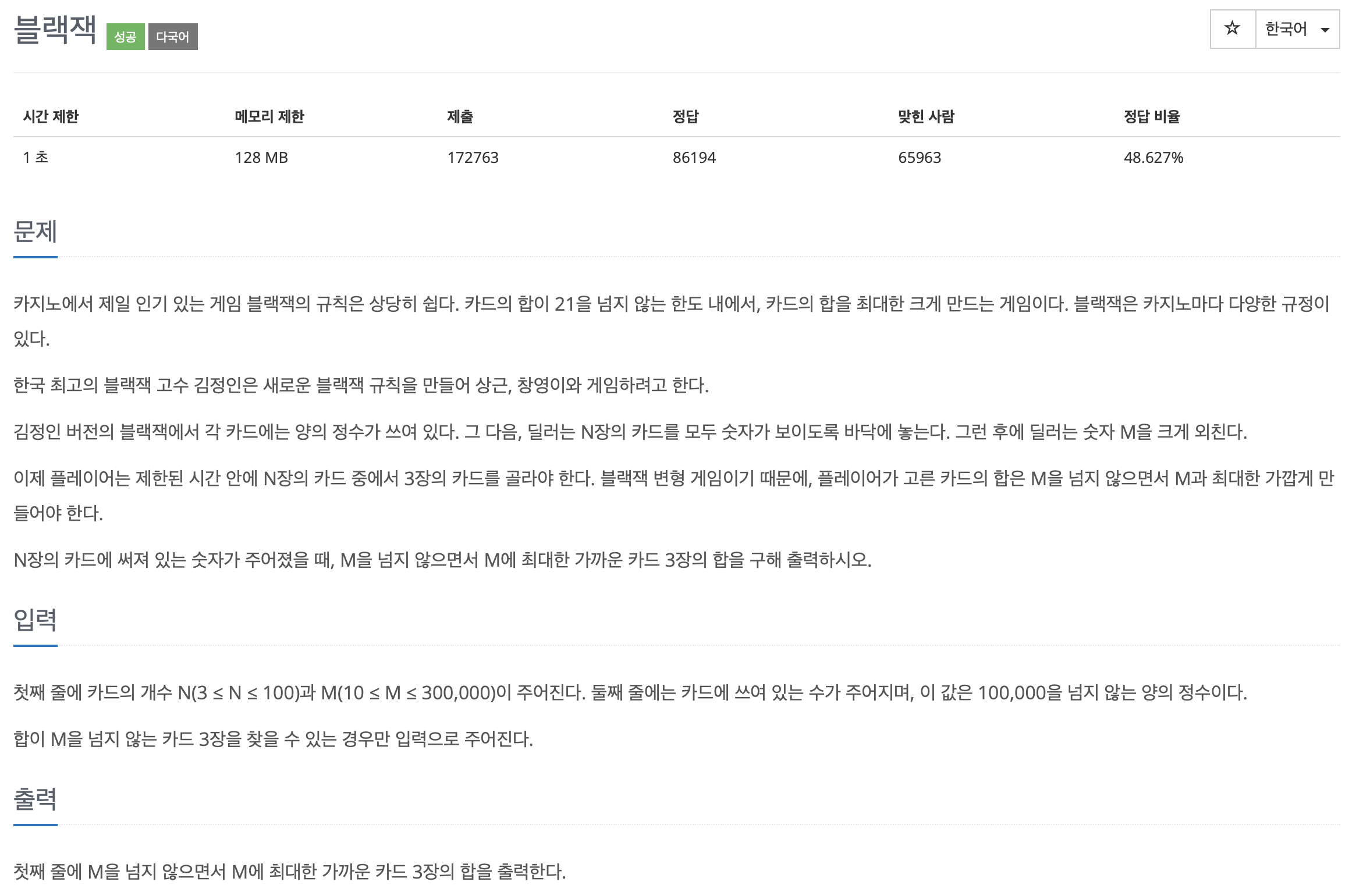 브루드 포스를 이용해서 푸는 문제 중 하나인 블랙잭을 풀어보았습니다.