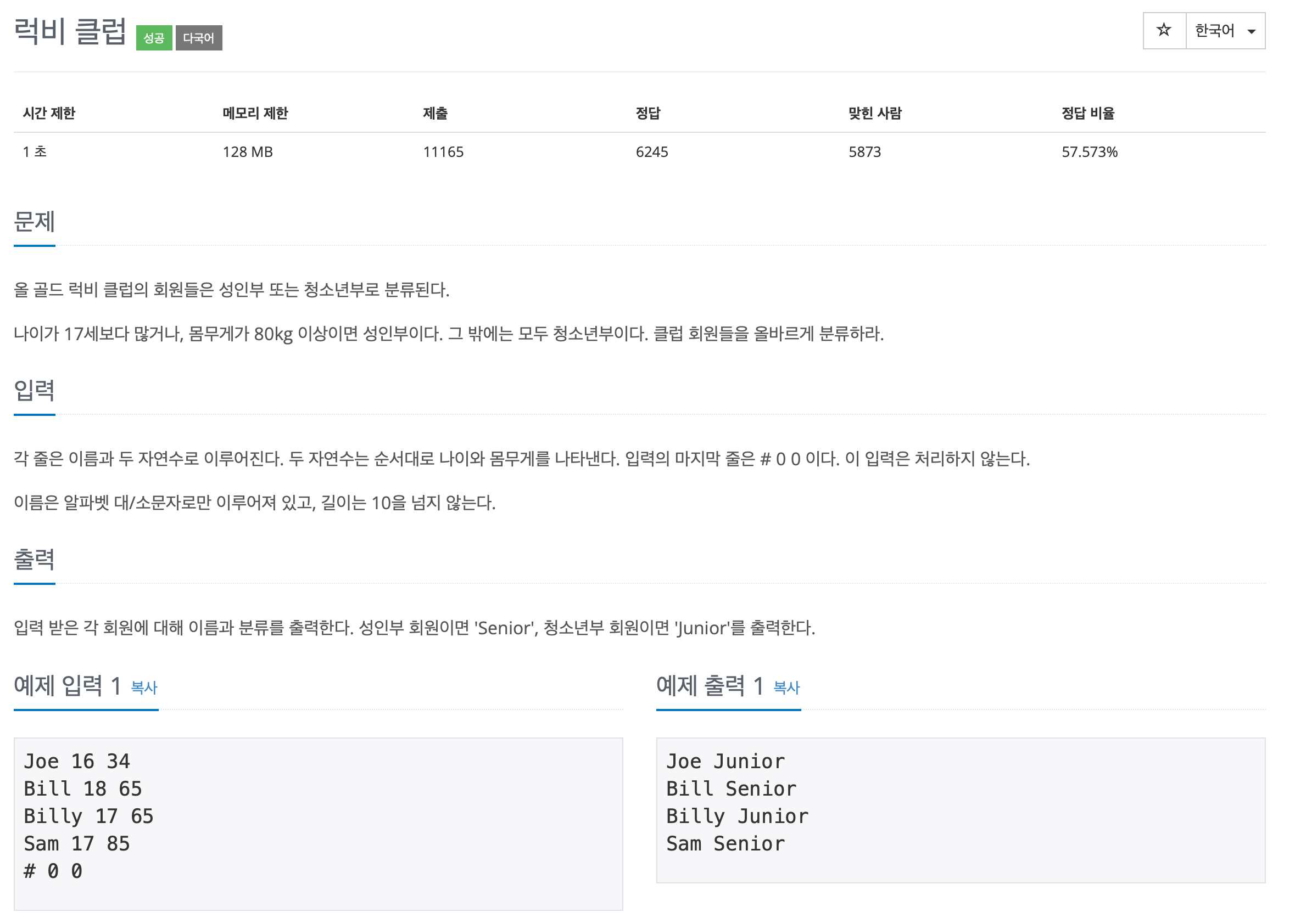 입력 받은 각 회원에 대해 이름과 분류를 출력한다. 성인부 회원이면 'Senior', 청소년부 회원이면 'Junior'를 출력한다.