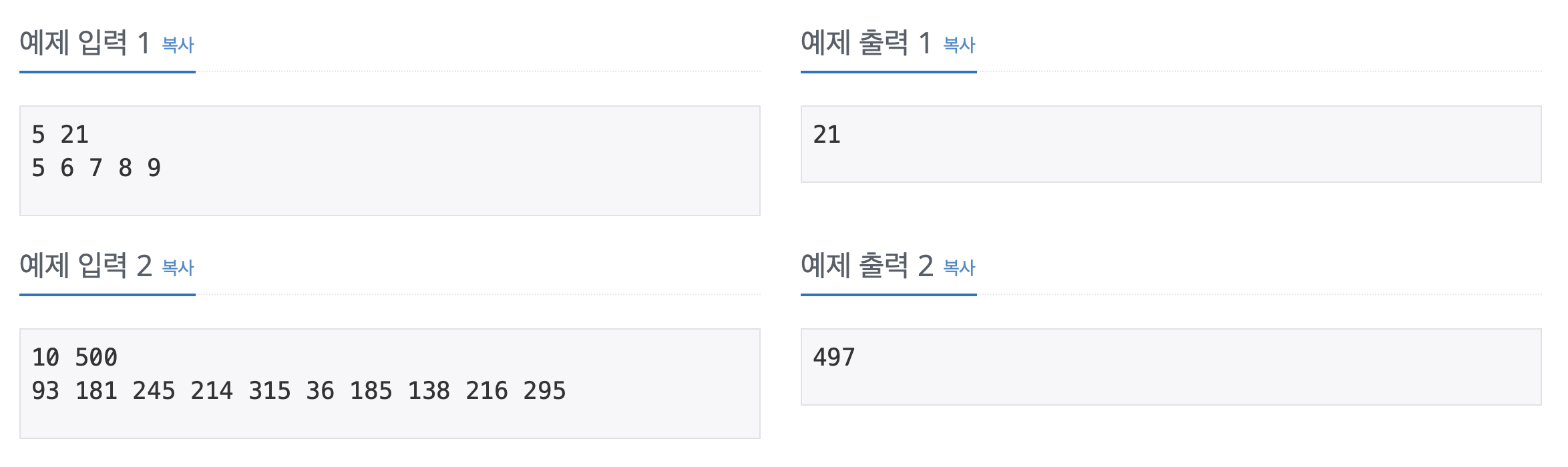 첫째 줄에 카드의 개수 N(3 ≤ N ≤ 100)과 M(10 ≤ M ≤ 300,000)이 주어진다. 둘째 줄에는 카드에 쓰여 있는 수가 주어지며, 이 값은 100,000을 넘지 않는 양의 정수이다. 합이 M을 넘지 않는 카드 3장